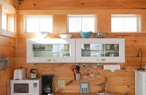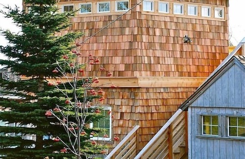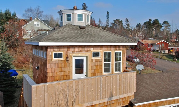 The 'Lighthouse' is a special lodging overlooking the town and harbor of Grand Marais from its center. You are right in the heart of town within a block of everything- yet comfortably removed when you need a breather. You can sit up in bed and view the harbor and the big lake beyond. If you would like to access the sauna please contact the owners in advance or book it yourself on our website and set up a reservation- it is an add on expense and is first come first serve. Total is $49 per night plus tax and it is booked on our direct site. November and April have sauna specials- please go to the sauna listing to see those. At the Lighthouse there is covered parking that leads to a stairway that takes you up to the Lighthouse. The view of the old harbor from the balcony is stunning. There is a wrought iron table and chairs on the balcony for relaxing. Inside the Lighthouse you will find a queen bed, tile shower and bathroom, galley kitchen, custom dining table for two, LCD TV (please bring your own streaming codes, there is no cable or area broadcast content). The bed is set at an angle and faces southeast to capture the views of the harbor in the morning through large windows. Many of our guests yearn for a connection with nature, the lake, the community, a reconnection with each other, and permission to come to a full stop for deep rest. There are transom windows around the perimeter of the apartment that let in light from all points on the compass but do not compromise privacy. Eye masks are provided for those that want to sleep in :-). Notice how the light changes as the day progresses. Observe the color differences around sunset or early in the morning as the Great Lake passes through its moods. The ceiling is very high and is vaulted and timberframed with unique 'Dragon Beams' from local timberframe artisans. Topping the lighthouse is an octagonal lighthouse cupola that lets light in all day and moonlight at night and contains a genuine ships lantern that you can switch on from the bed. And on top of the cuppola is a custom copper ball, in keeping with the lighthouses of the North Shore. The antique ship's light that occupies the cuppola can guide you as you walk home after a night of festivities in the town. There is an all cedar Finnish Sauna next door to the Lighthouse for your exclusive use for an additional fee. Usage comes with robes and additional towels and complete instructions. Simply state you would like to add the Sauna to the notes of your stay when you make your reservation and we will contact you with details and availability. If sauna availability is important to make your decision to stay with us then please message us before you make your reservation so we can see if it is available during your stay. Watch the fog roll in and out from your bed while you drink your morning coffee, and listen to the strains of local live music as the town celebrates the short summers at night. The gally kitchen is small but thoroughly modern with all the necessities. The Lighthouse is above the 'North Shore Fisherman's Cabin', a restored historic log home. The Lighthouse is known for its inspiring charm. There have been plays and musicals written here, a fair number of proposals, and a good number of honeymoons. Come share the fantastic energy that is The Lighthouse.