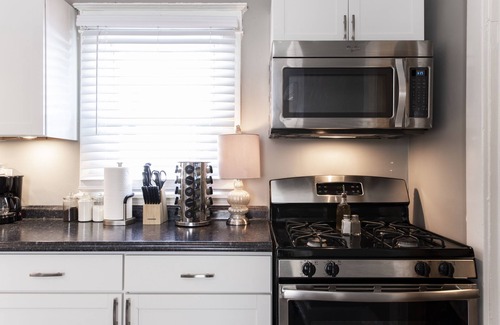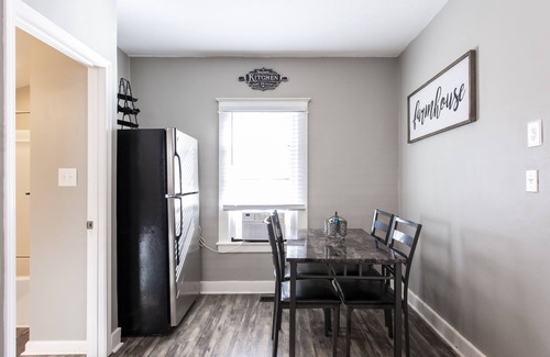 The fully stocked kitchen has everything you need to prepare your meals, and there's a dining table for four in the eat-in kitchen area, perfect for enjoying your homemade feasts or takeout from one of Louisville's renowned eateries.