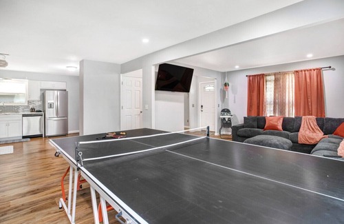 Living Room has large HD Smart TV with a comfy sectional couch, Table Ping Pong Game,