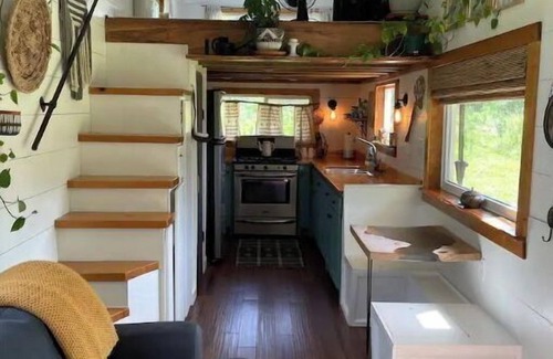 This thoughtful space has two lofted bedrooms (not totally private from the rest of the tiny house). A cook friendly kitchen and a bathroom with a washer/dryer.