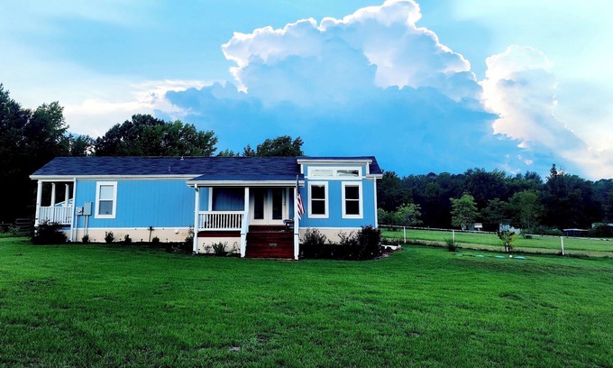 Relax in the adorable "Little Blue House" on a 13 acre farm in rural East Texas. This unique stay will give you all the comforts of home just yards away from longhorn cattle, mini ponies and donkeys and a herd of goats. The guest house is spacious and comfortable and built in 2018. Just a short walk across the backyard takes you to the brand new 30k gallon swimming pool and deck. (Pool is open May-Sept. and only for guests age 13+) Fall in love with the country life!