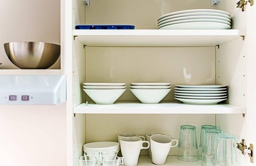 A kitchenette with a microwave, Nespresso coffee machine, mini fridge, 2-burner stove, range hood, kettle, toaster, dishes, and cooking utensils. Storage space.