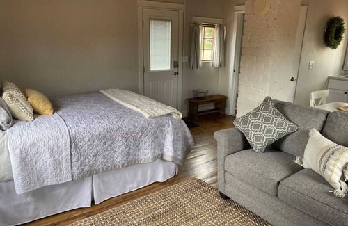 The modern conveniences of The Little House sharply contrast the old-fashioned construction. Original rough sawn ceiling joist are exposed, with the builder's layout marks clearly visible on the ceiling highlight the main living area where you can relax on the sofa. Along with the flat-screen TV, scorching fast 1 gigabit per second fiber internet (1000 Mbps) is available for streaming.