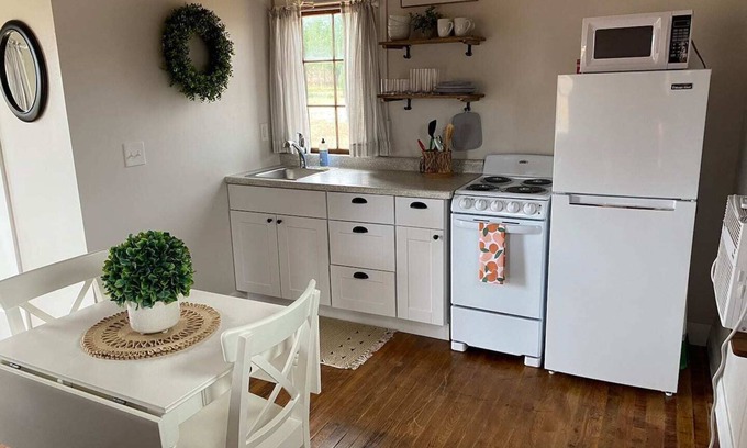 After a day of exploring the mountains or desert around Escalante, wash the trail dust off in a warm shower and let your muscles recover during a peaceful nights rest on the queen size bed. Open the windows at night to experience the 30-40 degree cooldown from the warm temperature of the daytime and the night sounds of a rural community. View the expanse of space from the back patio. When hunger strikes, the well-equipped kitchen boasts a to-scale fridge, range, microwave, sink, and plenty of dishware, so it won't be a struggle whipping up some of your favorite recipes in this small space. In the morning, make yourself a pot of coffee and head outside to watch the sunrise paint the walls of the Escalante River canyon or surrounding mountains.
