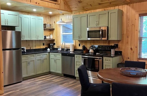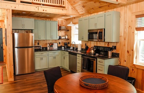 The Little Maine Cabin is a newly built custom retreat that elegantly blends stylish design with rustic charm. Featuring wood finishes, vaulted ceilings, and tasteful decor, this cabin offers a warm and inviting ambiance. It includes 1 bedroom and a cozy sleeping loft, ideal for small families, couples, or solo adventurers. The open floor plan showcases a fully equipped kitchen with modern appliances, a comfortable living area, and large windows that bathe the space in natural light and offer picturesque views of the surrounding woods.