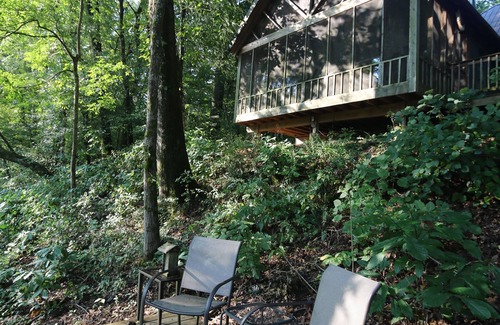 The cabin is very private, but near a variety of activities including hiking, biking, antiquing, water sports, and local restaurants. Relax on the screened porch and watch the river go by, stay warm by the outdoor fireplace, or catch trout from our dock.