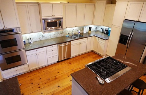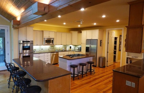 The adjacent, open-space kitchen is equipped with top-of-the-line appliances, including a double-oven, 6-burner gas cooktop, granite countertops, custom cabinetry, a wine cooler, an ice maker, two large islands with seating for eight guests, and a dining table that accommodates up to 10 more guests. Just off the great room, we have additional seating for six more guests on the screened-in porch. There is also a unique teak-root table in the great room that provides seating for 2 more guests.