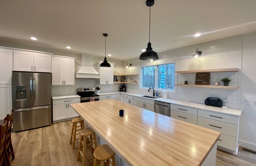 The large kitchen is fully stocked and ready for you to prepare delicious meals with your friends and family. The kitchen opens to the dining room which hosts a large table for group dinners as well as seating for four at kitchen island bar
