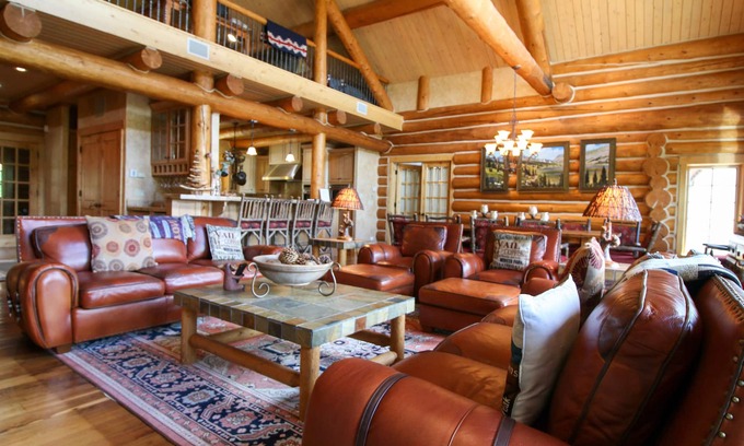 As you enter the home, the log-walled entry vestibule/sitting room opens up through a pair of wide French doors into the dramatic (25-foot high) Great Room and dining area with its floor-to-ceiling masonry fireplace, open vaulted log and timber ceiling, and rustic walnut floors. The large windows and doors open up to the south-facing deck and the spectacular golf course and mountain views beyond. A dramatic log truss, log posts, and wrought iron and wood railings further add to the drama and character. The Great Room also features a mini-bar for convenient entertaining.