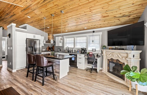 As you enter, please take advantage of the ample hallway that also acts as a mud room and is equipped with a bench, hooks for all of your outdoor gear, and boot tray for wet shoes. From there, just take the stairs up to the Lodge and make yourself at home!