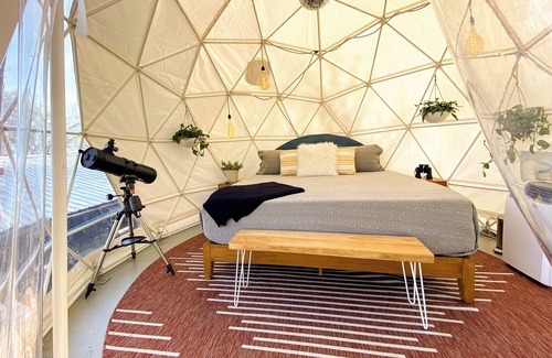 The Moonlight Dome (king bed) is located just outside the Lodge, and up a flight of stairs. Kick back and relax on the private rooftop deck, and use the telescope to stargaze. The dome shares the second full bathroom inside the Lodge. The dome is air conditioned (with blackout curtains!) during the warmer months. For the colder days, the dome has heat, and a heated mattress pad. Please note that the dome is not usable as a bedroom during the coldest months (Jan/Feb) due to the chill (insulation is limited inside the dome). As such, the nightly rate in January and February has been reduced to reflect 2 bedrooms and 2 baths available.