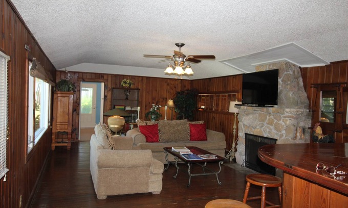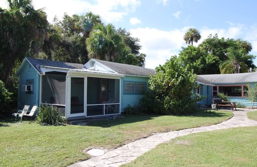 Historic Cottage looks like a Man Cave with Large stone fire place, big screen TV, Dade County pine floors and walls not to mention the large wrap around bar. This is a great place to hang out with friends after a day on the water or to hide away with that special someone. One bedroom King cottage , large bathroom, pull out couch in the living room, full kitchen with granite counter tops and separate dining area. Screened in porch overlooks the lagoon with a BBQ and picnic table patio. Located in St Lucie Village on a quiet on lane road with a 15 mile an hour speed limit. The property boasts almost six acres of tropical bliss. Bring your boat or use our Kayaks, picnic on one of the Islands within a 15 min Kayak trip or on our dock with its large terminal end and covered area for shade. If you like to fish this is the place for you with the inlet only one mile away you can boat to the Ocean in two miles or you can fish in the lagoon. For those who prefer land you can wade fish or fish from our dock. We have rod holders a cleaning station and fresh water wash down. The dock lights up at night for you night owls. We have lots of books and games as well as a horse shoe pit. The ice machine is 800 lbs so you can fill your cooler before heading to the beach...N Hutchinson Island has a beach 1.5 miles away and S Hutchinson Island is 2 miles away with a new beach about every quarter of a mile as you travel south. All holiday bookings are a minimum of 3 nights.