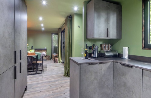 After a day of adventure, return to your luxurious woodland hideaway. The lodge itself has been finished to an exceptional standard, blending rustic charm with modern comforts. A cosy wood-burning stove forms the heart of the open-plan living space, creating a warm and inviting atmosphere on cooler evenings. Large picture windows and French doors bring the outside in, offering uninterrupted views of the surrounding trees and rolling hills beyond. The interiors are stylish yet snug, with plush furnishings, a fully equipped kitchen, and thoughtful touches throughout.