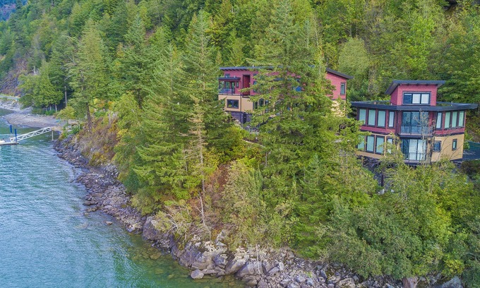 This serene property is 2.5 acres of secluded waterfront with hundreds of feet of private beach. Includes private dock, grassy areas for picnics or family play, community BBQ area and custom natural landscape design . All surrounded by an amazing 180-degree waterfront and snow-capped coastal mountain view.