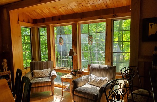 For that elderly guest, the main floor TV room can easily converted to bedroom with a sofa sleeper, and privacy curtains that can be pulled across the french doors.