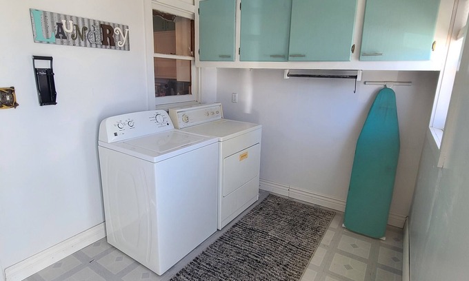 Full kitchen, 2 bedrooms, 1 bath, laundry room, and outdoor patio seating.