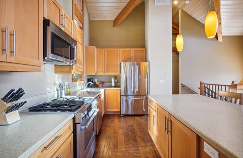 The open living area has a welcoming seating area with a plush sofa and three adjoining daychairs. There is also a large TV mounted above the gas fireplace. Time to head outside to theexpansive outdoor balcony, with a bistro set and gorgeous views in every direction. Enjoy diningoutdoors while watching the spectacular sunrises and sunsets. The couch and chairs aregathered around, making conversation easy. The fully equipped kitchen boasts stainless steelappliances and a large island that offers seating for two people. Breakfast and happy hour willbe leisurely as your entire group can gather at the Island and sit comfortably at the dining tablethat can accommodate seating for six.
