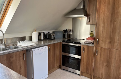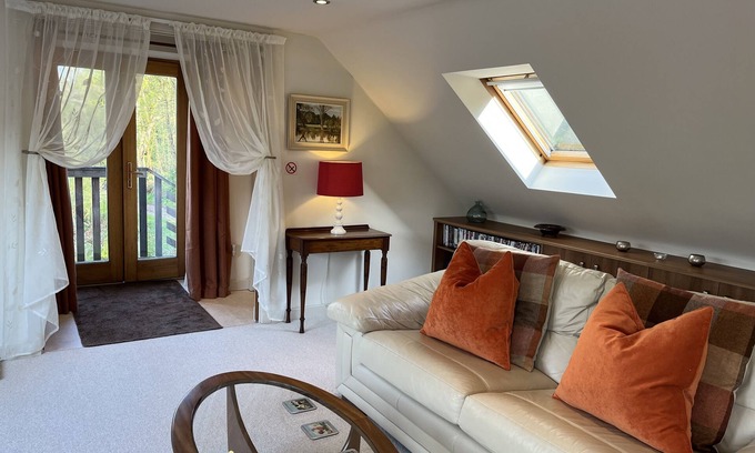 The Loft occupies the top floor of the store building of a former jute mill. It is a totally self-contained apartment which is accessed by an outside staircase. It has sloped ceilings with roof windows to make the most of the breathtaking views across the rivers, tree-tops and to the hills beyond.