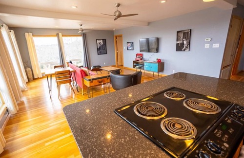 The Loft occupies the entire second floor and has been completely renovated from its late-1950s origins into a modern beauty. The mid-century aesthetic has been kept, while bringing in contemporary amenities with fresh colors and stylish fixtures. Light pours through the floor to ceiling, wall-to-wall windows on two sides over gleaming hardwood floors. The spacious living room has two ceiling fans, a television with Roku and streaming channels, and a variety of games to enjoy.