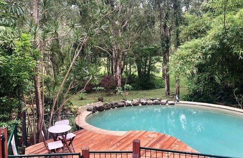 The Loft House is set on 2 Private acres in the heart of the Glasshouse Mountains. It has enormous character. Enjoy the swimming pool, large entertaining deck, relaxing day bed and outdoor BBQ. It is a lovely sanctuary with a tropical feel. Only minutes from Australia Zoo and a short drive to Montville and Maleny townships and 20 minutes from Sunshine Coast beaches. Perfect for families and groups