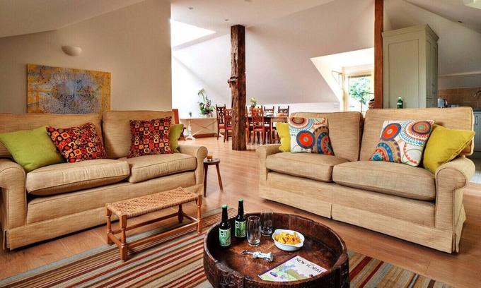 Welcome to The Loft! A stunning airy loft apartment in Kingham in the Cotswolds. This apartment is perfect for small families or couples looking for a romantic getaway. The Loft is equipped with modern conveniences to ensure a comfortable stay, including radiant floor heating throughout. This property is located on the second floor with a flight of stairs leading up to the main entrance.The open-plan living area features a large antique oak dining table with chairs, cozy sofas arranged around a satellite TV, and a fully equipped kitchen positioned to one side. French doors at the entrance and adjacent to the kitchen lead to a Juliet balcony, offering serene views into the treetops. A glazed cupola above the dining area fills the space with natural light throughout the year.The Loft accommodates 4–6 guests. It includes a double bedroom with a king-size brass bed and TV, located conveniently across the hallway from a spacious walk-in shower room with a double sink and toilet. The generously sized twin bedroom features a large en-suite bathroom with a walk-in shower and a double-ended bathtub. The twin beds can be converted into a super-king bed, and if needed, two additional full-size single beds can be added to the room, increasing the total capacity to six beds. Please inquire about the additional charge for this option.Parking for The Loft is located in front of Kingham Lodge. Wi-Fi broadband is available across the site. The pool and steam room are conveniently located beneath The Loft, and five acres of gardens at Kingham Lodge are accessible to guests via a short path from the front steps of the property. However, this property does not have its own private garden space.For families, a highchair and travel crib are provided, with the option of a larger crib or newborn cradle available for a $20 supplement. To maintain the high-quality furnishings of our properties, The Loft is strictly non-smoking and pet-free.There are 5 cottages on site and operate a private 'swim time' for each individual cottage, so all groups of guests have private family time in the pool. Your time changes each day and this information is shared with you in your booking confirmation email. You can also enjoy an early morning swim that is open to everyone. The pool is used by Kingham Lodge owners only after 4:30 pm. Pool towels are provided for you in your cottage and the owners will give you a pool safety briefing on arrival.The owners at Kingham Lodge have 5 holiday cottages available on site for large gatherings sleeping up to 26 people. Do call us about booking multiple cottages for a large family celebration.