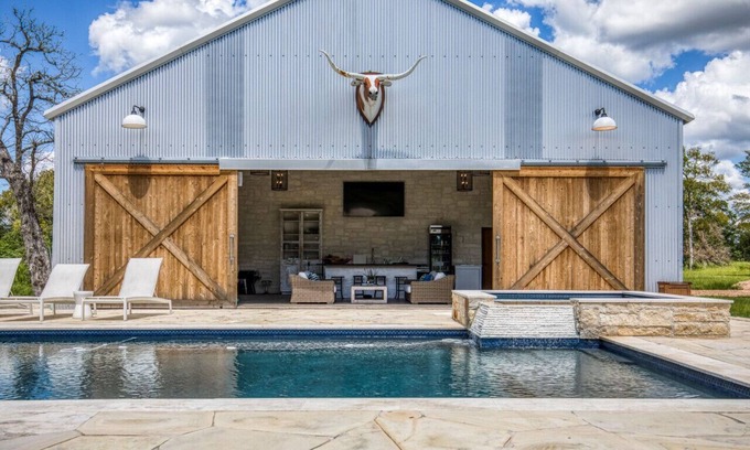Enjoy premium amenities like a luxurious pool and hot tub, pickleball, and a spacious party barn. Unwind on the sprawling porches or explore the rolling hills. Whether you’re seeking relaxation or adventure, The Longhorn offers the perfect getaway to experience Texas country life in style.