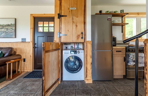 Inside you will find cozy interiors. The main level has a great kitchen with all the appliances you would need (fridge, stove, dishwasher, toaster oven). The coffee set up is excellent and there’s even a pantry and a compact European steam washer/ dryer. The living area has forever views, a comfy leather sofa, rocking chair, and an easy to use pellet wood stove. The bathroom has a gorgeous slate shower and plenty of room for storage.