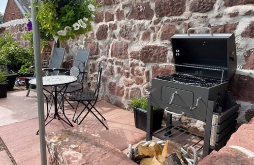 Patio dedicated to guests of the Lookout in the back garden. Patio with dining set, reclining chairs, charcoal BBQ and fire pit.