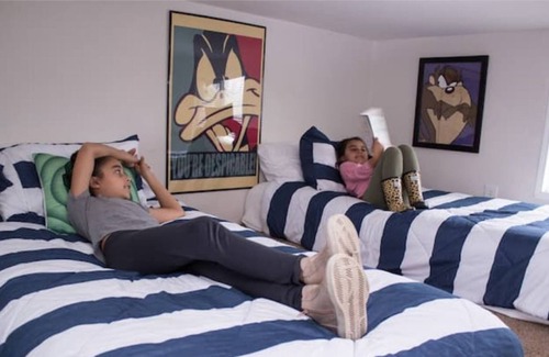 ✨ Lofty Bunk Beds and Cozy Master Bedroom: Unwind in the playful loft area, featuring charming bunk beds adorned with Looney Tunes characters. For ultimate relaxation, retreat to the private master bedroom furnished with a snug queen bed.