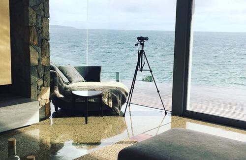 The open plan living area is spacious with panoramic views of Lagoon Beach and historic Low Head Pilot Station, Café and Museum. A king modular lounge has its own day bed with great views and a 65 inch TV hidden behind a sliding panel above the stone fireplace. There is also a separate circular day bed in the floor to ceiling glass bay window with its own binoculars to explore passing ships and the spectacular views of Lagoon Beach.