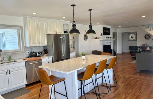 - Modern Chef's Kitchen: Your culinary dreams will come true in the chef's kitchen, equipped with new stainless steel appliances, a gathering island with seating for 5, and an adjoining dining area that comfortably seats 8.