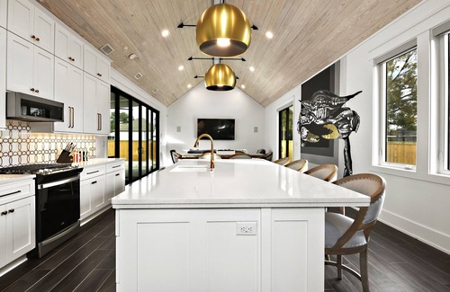 Your comfort and enjoyment are paramount at The Luxe on Main. This sophisticated home features expansive windows, vaulted wood ceilings, and hand-crafted oak furnishings, creating an ambiance of warmth and style. The gourmet kitchen, equipped with state-of-the-art appliances and an oversized island, is perfect for both catering and entertaining guests. Each suite is adorned with chic décor and boasts access to private outdoor areas—ideal for post-ceremony relaxation or pre-wedding gatherings. Additionally, enjoy luxury amenities such as high-speed Wi-Fi, smart TVs, and cozy bathrobes for a pampering experience.