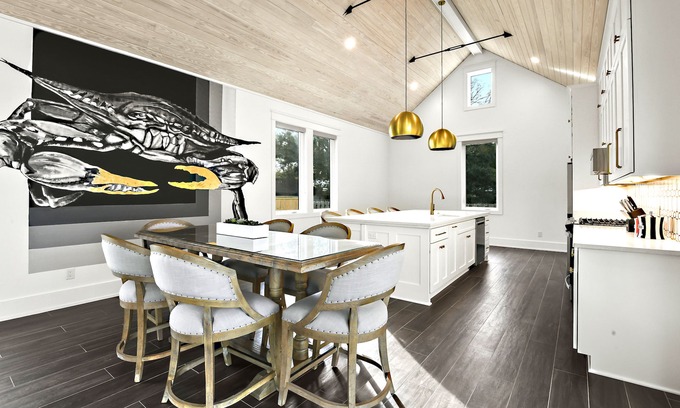- Elegant Design: The property showcases stunning architectural details such as vaulted wood ceilings, expansive windows, and beautiful mural art, creating a chic and inviting atmosphere for your wedding stay.