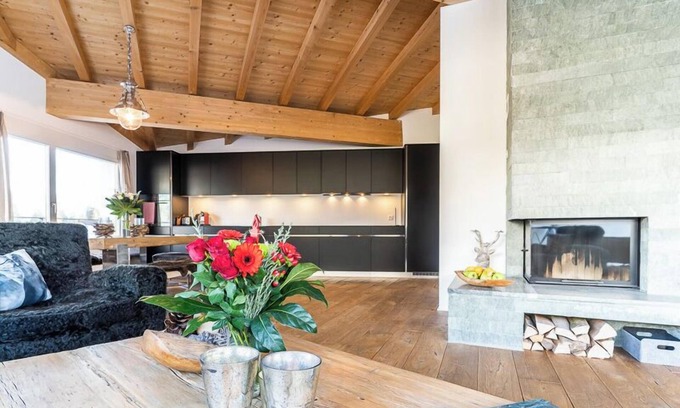 After a long day of skiing, enjoy cozy hours by the fireplace and the wonderful mountain panorama. On a sunny day, the view is best enjoyed from the apartment's roof terrace.