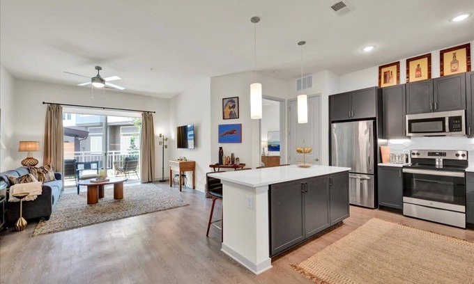 The living space itself is extremely spacious and updated. Upon entering you will be greeted by the open concept with 10 foot ceilings. The modern kitchen with stainless steel appliances and quartz counter tops is stocked and ready for basic cooking. Each bedroom is equipped with king size, memory foam mattresses perfect for sleeping off a day on the bourbon trail. Two full bathrooms (one with a tub shower combo and the other with a stand up shower) are connected to the bedrooms. One of the bathrooms has "Jack and Jill" doors for easy access from the common area.