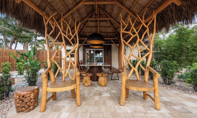 • Oversized tiki hut with exotic stone dining table for 10 and sculptural chairs photo-worthy from every angle