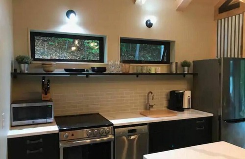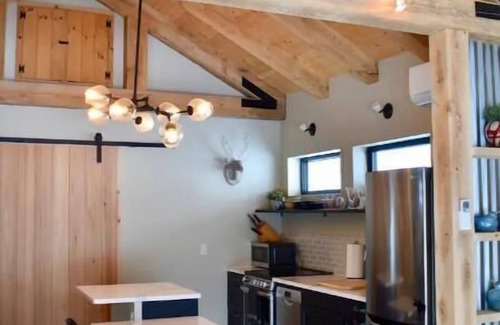 "The Maple Moose" was designed and built to be a luxury, modern version of the old sugar shacks of Vermont. On entering the house through the porch you will be in the living space with vaulted wood ceiling and rough hewn hemlock posts. There is smart TV for streaming your favorite Netflix or Prime shows (no cable) and a Bose stereo sound system. If you'd rather make your own music, we include a rather nice acoustic guitar. The large sliders open on to a well-proportioned deck with outdoor dining and casual chairs for enjoying morning coffee. The kitchen features luxury stainless appliances as well as a Nespresso coffee maker, island and dining table. Through the large wooden barn door is the bedroom with en-suite bathroom. There is ample closet and storage space. The bathroom has a glass door shower and water-sense rain shower.