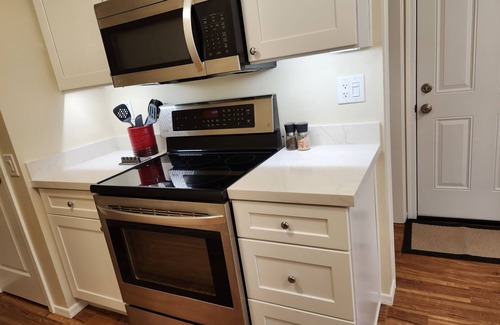 - The kitchen is well equipped with lots of cooking supplies, large assortment of spices, electric stove, double door refrigerator (with water and ice), dishwasher, and microwave. Dishwasher pods and soap provided.