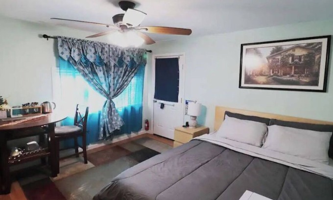 The Master's Bed and Bath Guest Suite has an en suite bathroom and features the following: Off-street parking, a mounted flat screen roku tv, fridge, microwave, coffee maker, dining table and chairs, a very comfortable queen sized bed, wireless internet and a closet for your luggage's and clothes. Enjoy the fresh air in the private deck just outside your front door. The gated entrance has a paved pathway that leads to the small staircase going to the private guest room. If you'd like to take a walk outside, our place is just few blocks away to stores, restaurants and cafe.