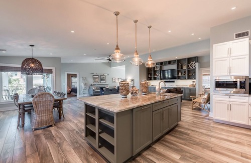 Step inside this expansive 3,000+ square foot house, where you will find a massive open living, dining, and kitchen area highlighted by soaring ceilings. The gourmet kitchen features a gas range, wine refrigerator, and ample seating for 14, ensuring that every culinary wish is fulfilled. Your guests will enjoy the comfort of 2 king beds, 2 queen beds, 4 double futons, and a memory foam pull-out couch, alongside outdoor amenities like an outdoor bar, grill, and large deck space for post-wedding celebrations. Take advantage of the nearby Key Allegro pool and community facilities just a short walk away, allowing for relaxation amidst the festivities.