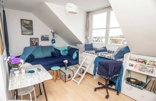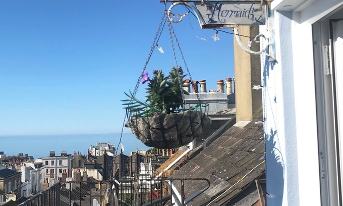 As featured in BBC, Metro and We Love Brighton...Welcome to The Mermaid Inn! My home since 2019, which I’ve designed to be an ocean-themed romantic /writers rooftop retreat with sea views. A small but perfectly formed space drenched in sunlight, with a stunning balcony, and sea view from every room. On a pretty multi-coloured street, 5 mins walk to the sea, 15 to train station. Half way between Brighton and Hove, right by great cafes & bars. Great for a couple or solo travellers, or suits 3 friends if you don’t mind getting cosy! There is a comfy sofa bed in the lounge that converts easily to a Queen size bed. If youre driving, we have Street Parking permits £7 a day.