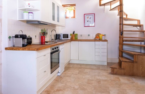 The Mews has been beautifully converted from a tumbled down barn into a charming cottage and furnished to a very high standard. Exposed beams, re-pointed stone walls and stone floors all merge seamlessly to create a serene, comfortable living environment. Bedroom has aircon.