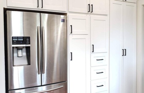 The bright kitchen has white quartz countertops, a large farmhouse sink, and stainless steel appliances (gas range). There are many appliances, cookware, and dishes to make you feel like you are at home. Hidden in the new built-in wall of cabinetry is a stackable washer and dryer.