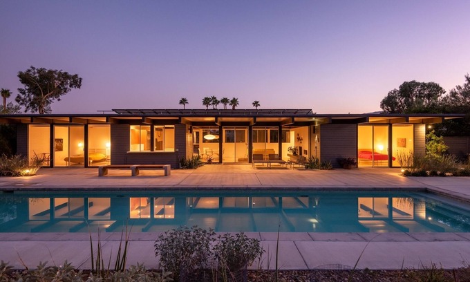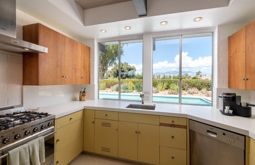 Welcome to your own private wellness retreat, the Stout Residence (c. 1969, architect J. Edward Esmay), as featured in Dwell. The pinnacle of mid-century modern style, comfort and charm, this historic post-and-beam home with echoes of Joseph Eichler’s best work merges form with function by seamlessly integrating indoor-outdoor living with multiple patios, a luxurious 50-foot pool, outdoor shower and barbecue and floor-to-ceiling glass revealing spectacular mountain views from each room. Set on a thoughtfully landscaped and private half-acre lot featuring lemon, orange and grapefruit trees, the spacious 4 bedrooms, 2.75 baths layout features terrazzo floors throughout, original teak and mustard metal kitchen cabinetry with top-of-the-line modern appliances, clerestory windows, custom built-in cabinetry and closets in each bedroom. 1 Gigabit Internet and two separate home offices also make the property ideal for WFH.