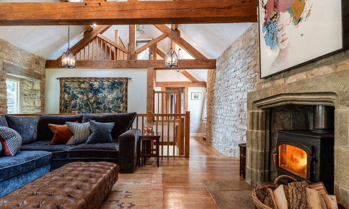 Accessed via the staircase in the dining room with exposed stone walls, wood burner, Smart TV with apps (account holders only), six-seater corner sofa, selection of board games, doors to patio and Juliet balcony