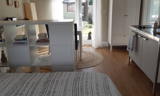 The Milliner's is a studio apartment situated in the garden of a larger house. The name of the flat comes from the fact that the space used to be a ladies' hat shop. The flat contains a large shower room, a kitchenette, a comfortable double bed and a dining area with tea and coffee making facilities. Entrance to the flat is through the side gate to the garden situated to the right of the main house.