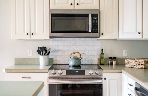 KITCHEN: stocked with everything for basic meal prep, with basic spices, stainless steel appliances (stove, microwave, dishwasher, fridge), coffee maker w/ medium roast coffee, whistling kettle w/ breakfast teas, and complementary breakfast.