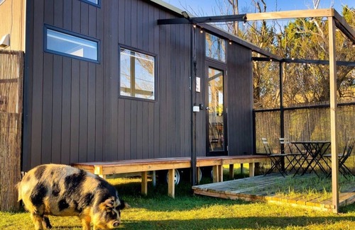 The Minimalist Tiny House by Tiny Away is a private property located directly on a large paddock, separate from the main building/residence, surrounded by some of the pub animals such as the Kune Kune pigs, calves, chooks, and more.