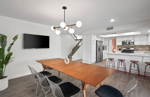 The Modern Indio provides a wonderful retreat for large groups looking for a comfortable and relaxing space in Coachella Valley. The two-story home provides 6 bedrooms and 3 bathrooms allowing for up to 18 guests. Each bedroom with the exception of the bunk room features a 50-55` smart tv connected to all popular streaming services (no cable provided). The upstairs master bedroom offers a king bed, an ensuite bath with a large walk-in closet, designated office space, and access to the balcony overlooking the pool and nearby mountains. There are 3 additional bedrooms upstairs share a full bathroom; 2 rooms offering a queen bed and the last bedroom offering 2 queen beds. The remaining 2 bedrooms are downstairs and share a hallway bathroom. One bedroom has a king bed and access to the backyard via a sliding glass door and the other a full over full bunk bed with a twin trundle. The kitchen has stainless steel appliances and is fully stocked with all the necessities needed for prepare a full family meal. The garage has been converted to a spacious game room with an 8 feet billiard table, foos-ball table, a mounted connect four, and a 75` smart tv. There are plenty of space to spread out whether in the game room, living room, or dining room.