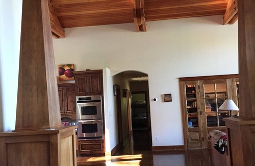 The kitchen is well equipped for the gourmet chef with a five burner cooktop and double ovens. You’ll find every small appliance and utensil imaginable in the kitchen. There is a large walk-in pantry fully stocked with a wide array of spices and has plenty of room for your groceries. With a slab granite island, and richly stained alder cabinets, you’ll find the kitchen an inviting place to gather. The beauty of the kitchen is heightened by the 20’ceilings, trusses that are an extension of the great room and sweeping views of both the lake and cherry orchard behind the house.